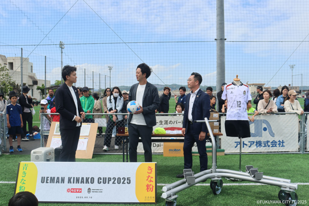 福山シティフットボールクラブと共催した『UEMAN KINAKO CUP2025』が開催されたエヴォルヴィンフットボールフィールドに、子どもたちが安全に重たいゴールを運べるように『ゴール運搬車』とサッカーボールを寄贈させていただきました。