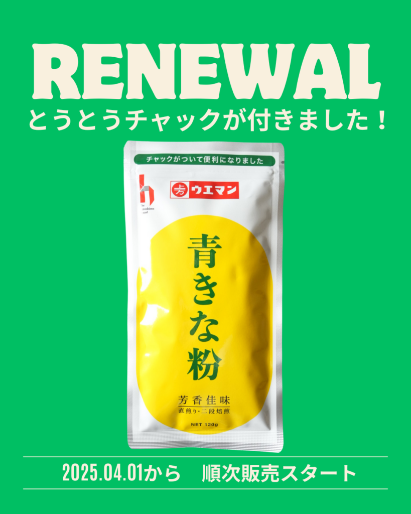 このたび、長年皆様にご愛顧いただいているウエマンのきな粉、青きな粉をリニューアルしました。